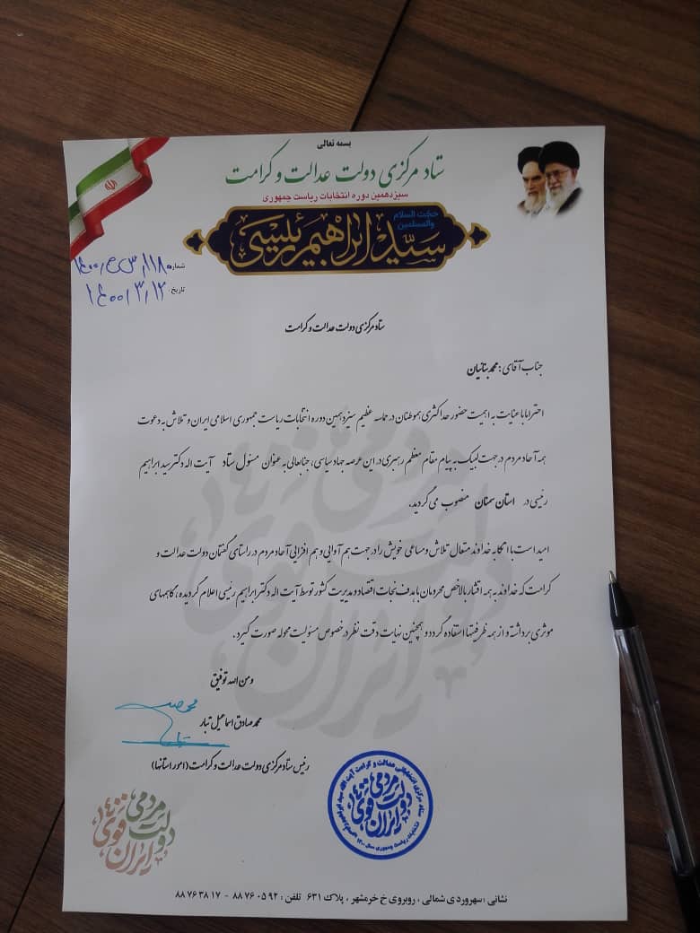 احتراما با عنایت به اهمیت حضور حداکثری هموطنان در حماسه عظیم سیزدهمین دوره انتخابات ریاست جمهوری اسلامی ایران و تلاش به دعوت همه آحاد مردم در جهت لبیک به پیام مقام معظم رهبری در این عرصه جهاد سیاسی، جنابعالی به عنوان مسئول ستاد آیت اله دکتر سید ابراهیم رئیسی در استان سمنان منصوب می گردید.